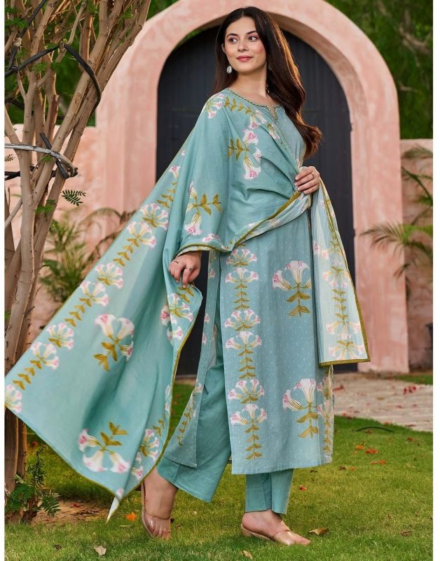 Featuring a beautifully floral printed Cotton kurta with subtle hand embroidery on the neckline, it’s paired with a matching printed mal cotton dupatta and comfortable solid cotton pants.